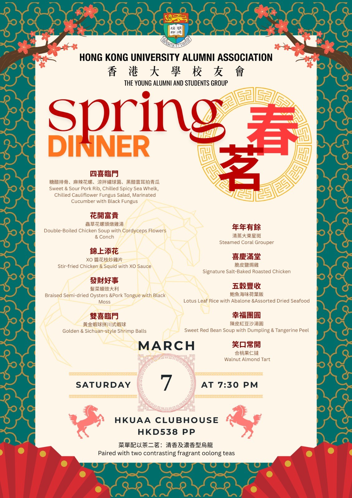 You're warmly invited to the Hong Kong University Alumni Association (Young Alumni and Students Group) Spring Dinner — an evening celebrating the Year of the Horse with banquet classics, reunion, and convivial conversation.